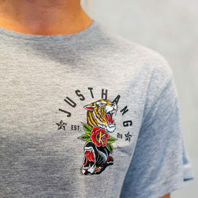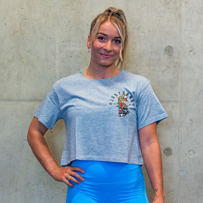 Le Crop-top pour femme JUSTHANG Pantiger, présenté ici en coloris gris chiné, est un modèle à manches courtes, conçu pour vos sessions de fitness et de training.