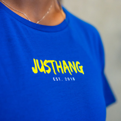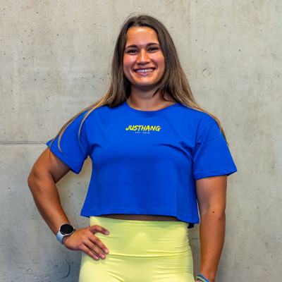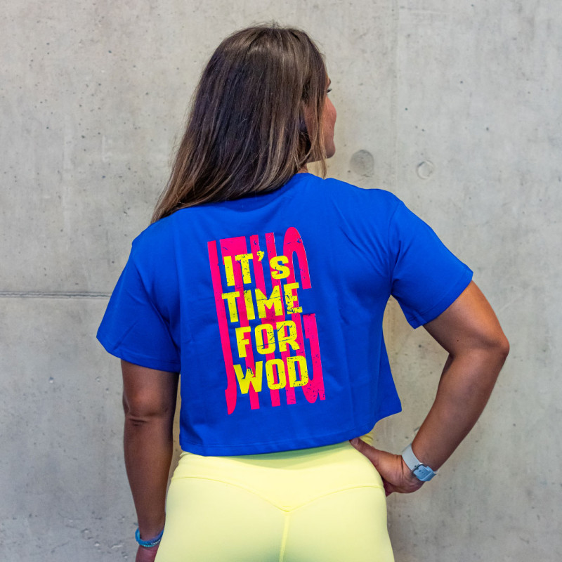 Le Crop-Top Oversize pour femme JUSTHANG Time For WOD, présenté ici en coloris bleu, est un modèle à manches courtes, conçu pour vos sessions de fitness et de training.