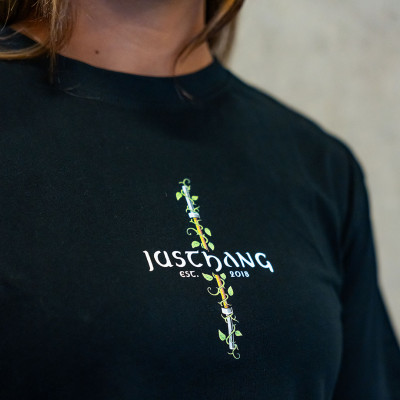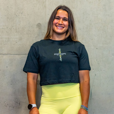 Le Crop-Top Oversize pour femme JUSTHANG Barbell Destiny, présenté ici en coloris noir, est un modèle à manches courtes, conçu pour vos sessions de fitness et de training.