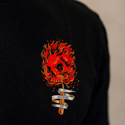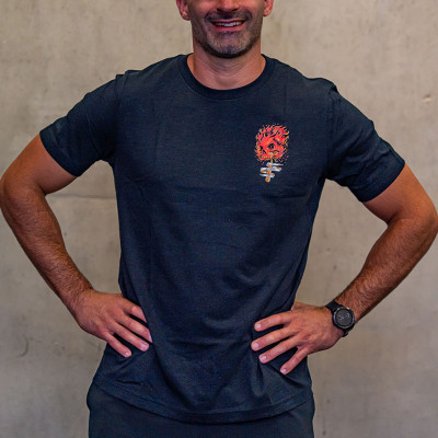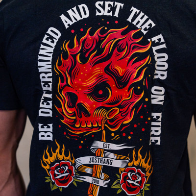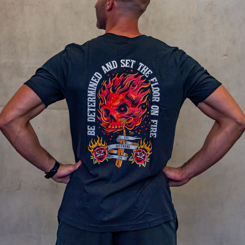 Le T-shirt pour homme JUSTHANG Floor On Fire, présenté ici en coloris noir, est un modèle à manches courtes, conçu pour vos sessions de fitness et de training.