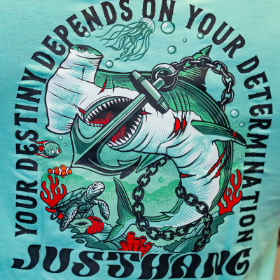 Stylé, il se compose d'un design old school comprenant un requin marteau se débattant d'une ancre l’entourant !