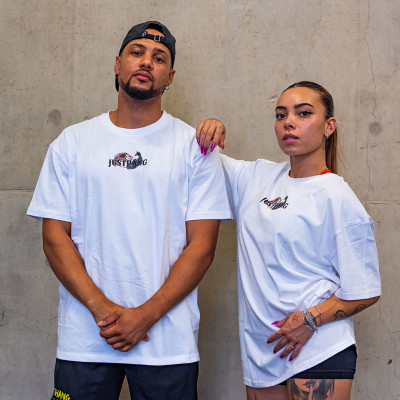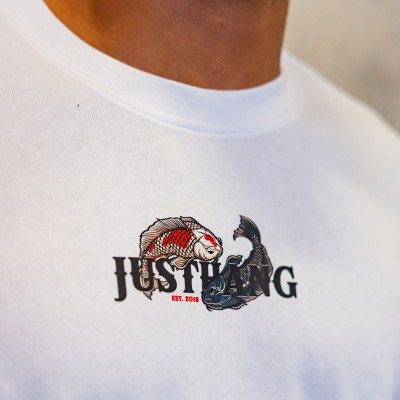 Le T-shirt unisexe Oversize JUSTHANG Koi Carp, présenté ici en coloris blanc, est un modèle à manches courtes, conçu pour vos sessions de fitness et de training.