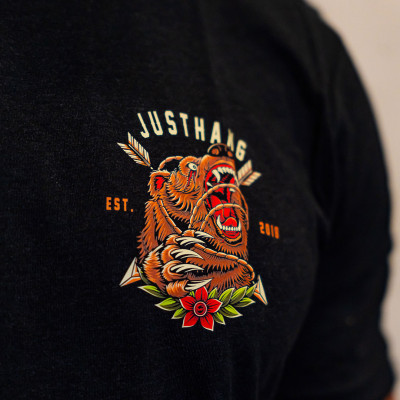 Le T-shirt pour homme JUSTHANG Bear Gets Up, présenté ici en coloris noir, est un modèle à manches courtes, conçu pour vos sessions de fitness et de training.